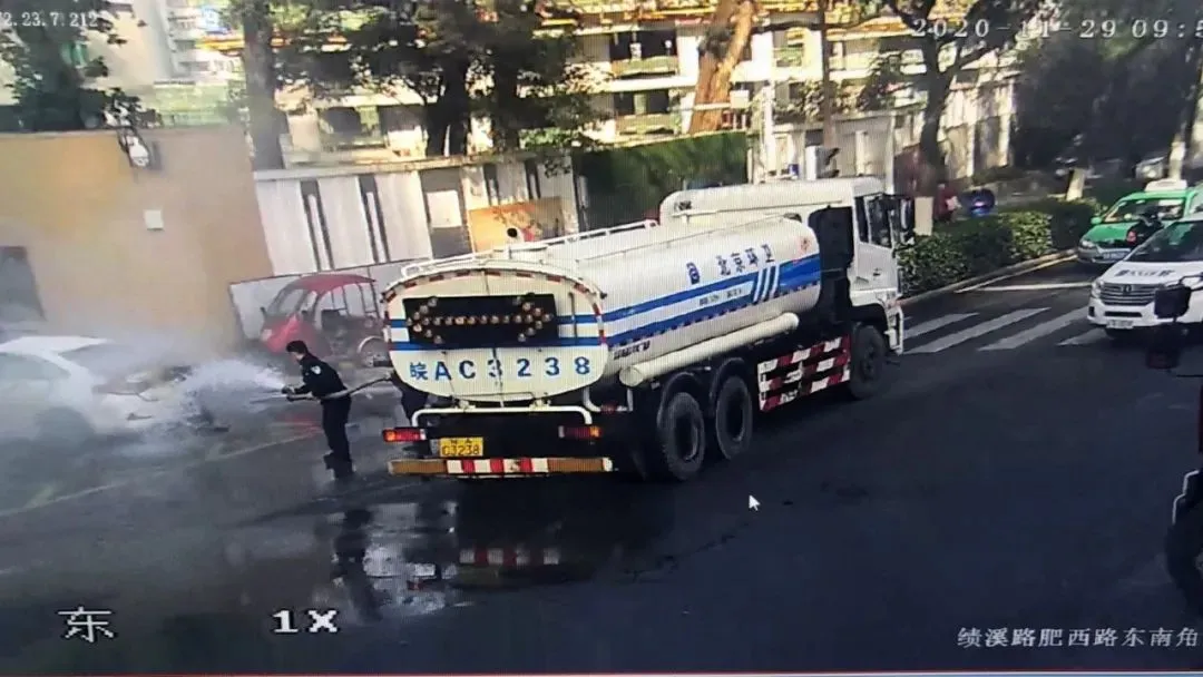 由于轿车火势较大,民警携带的灭火器始终无法有效灭火。由于消防车还在赶来的路上,为防止汽车进一步燃烧爆炸危及过往车辆和行人安全,警方及时拦下路过的洒水车对事故车辆进行灭火,稳定了火势。