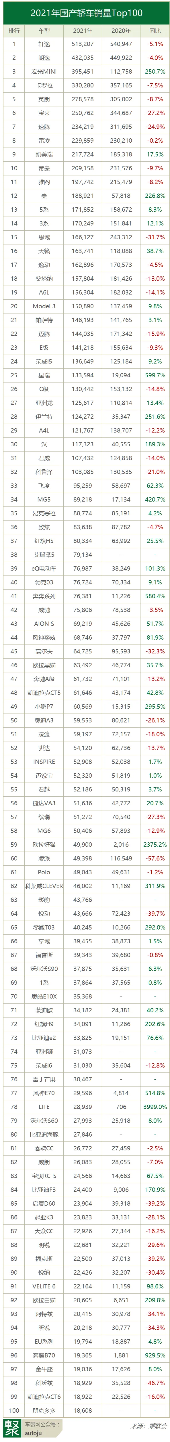 宏光MINI EV以395,451辆成绩跻身第三位,同比激增251%。这是一款电动车、一款最便宜的轿车之一、也是中国品牌轿车的历史最好成绩,这个结果令人意外,又在情理之中。意外的是,它打破了合资轿车长期垄断前几名的格局,更是在10月和12月以4.78万辆和5.06万辆的成绩夺冠。情理之中的是,它坚持为人民造车,主打最擅长的性价比 。2.88万起售价的它,还送绿牌,确实比自行车香。不过宏光MINI EV似乎也有瓶颈,近几月销量增幅收窄甚至出现下滑迹象。除消费升级外,主因是竞品多了。奇瑞eQ、长安奔奔EV、雷丁芒果、朋克多多等新旧势力的合围下,给它带来了不小压力。被挤出前三的是卡罗拉。2021年销量下滑7.5%至330,280辆,降至第四位。作为全球最畅销车型之一,卡罗拉在中国热销也属正常操作。至于销量下滑,或与「燃油泵门」大召回有关。英朗以278,578辆销量位居第五位,同比下滑8.7%。英朗能热销并重返一线行列,除了终端大优惠外,更重要的是换回了四缸发动机。有时候市场不讨论对错,只反应消费者心理感受。第六、第七位的依次是宝来和速腾——25.08万辆和23.42万辆,同比下滑27.2%和24.9%。它们是“缺芯”风波中受创最严重的车型,三季度更是持续出现50%以上的同比下滑,停产、减产传闻不断。作为卡罗拉的姊妹车,雷凌销量也不差。2021年以229,859辆销量位居第八位,同比微降0.2%。作为后来者,雷凌的品牌认知还有提升空间。凯美瑞2021年销量增长17.5%,以217,724辆超过雅阁,位居第九位,也是唯一进入前十的B级车。中期改款后,外观更加时尚,更符合消费者的审美,再加上厂家力保其产能供应,因此,凯美瑞笑到了最后。前十中已有两个中国品牌:宏光MINI EV和帝豪。比亚迪秦很可能在今年成为下一个跻身前十的中国轿车。它在11月跻身前五,2021年销量同比暴增226.8%至188,921辆,排名第12位。电动化果然是利器。其中,雅阁2021年销量下滑8.2%至197,742辆,跌至第11位。随着芯片供应改善,它未来或将重回前十,甚至夺回B级车销冠。天籁销量虽然实现增长38.7%,但163,741辆的成绩与凯美瑞和雅阁相比,仍有很大差距,排名第16位。作为日系「三剑客」之一,天籁似乎掉队了。华晨宝马5系和3系不相伯仲,都略超17万辆,依次排名第13、14位。2021年,它们销量也受供应链影响,但仍有8.3%和12.1%的增长。2021年5月,5系和3系更是双双跻身轿车前十,买豪车性能是刚需啊。相比5系和3系,奥迪A6L出现14.1%的下滑,排名降至19位,全年销售156,304辆。除芯片影响外,红旗H9或有分流。Model 3去年在华销量增长9.8%至150,890辆,位居第20位。虽然争议不断,但市场具有遗忘性和趋利性,理想ONE改款亦如此,越维权越畅销。变量是年底时它又涨价了,26.6万的起售价是否被消费者接受,还要看到时的数据。第100名的轿车叫朋克多多,又一款向宏光MINI EV致敬的微型电动车,由低速电动车老牌厂家河北御捷推出,去年9月上市就销了1.8万多辆。中国市场,既残酷又包容。自主品牌的变化今非昔比,前100中有近40款。它们的路线大致有三:▎电动化。比如宏光MINI EV(第3名)、秦(第12名)、汉(第30名)、eQ(第39名)、AION S(第43名)、黑猫(第46名)、P7(第49名);换道超车,是可能的。