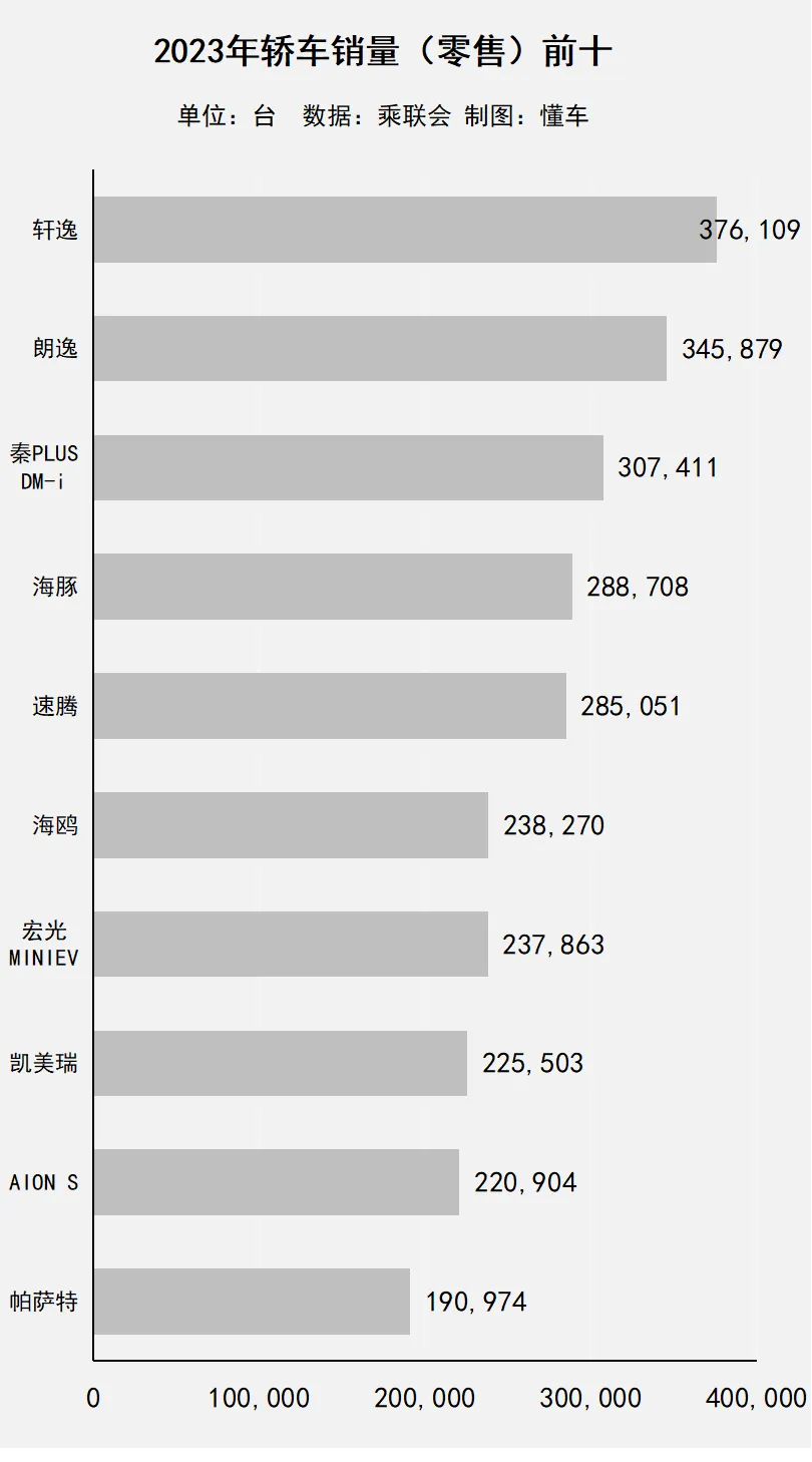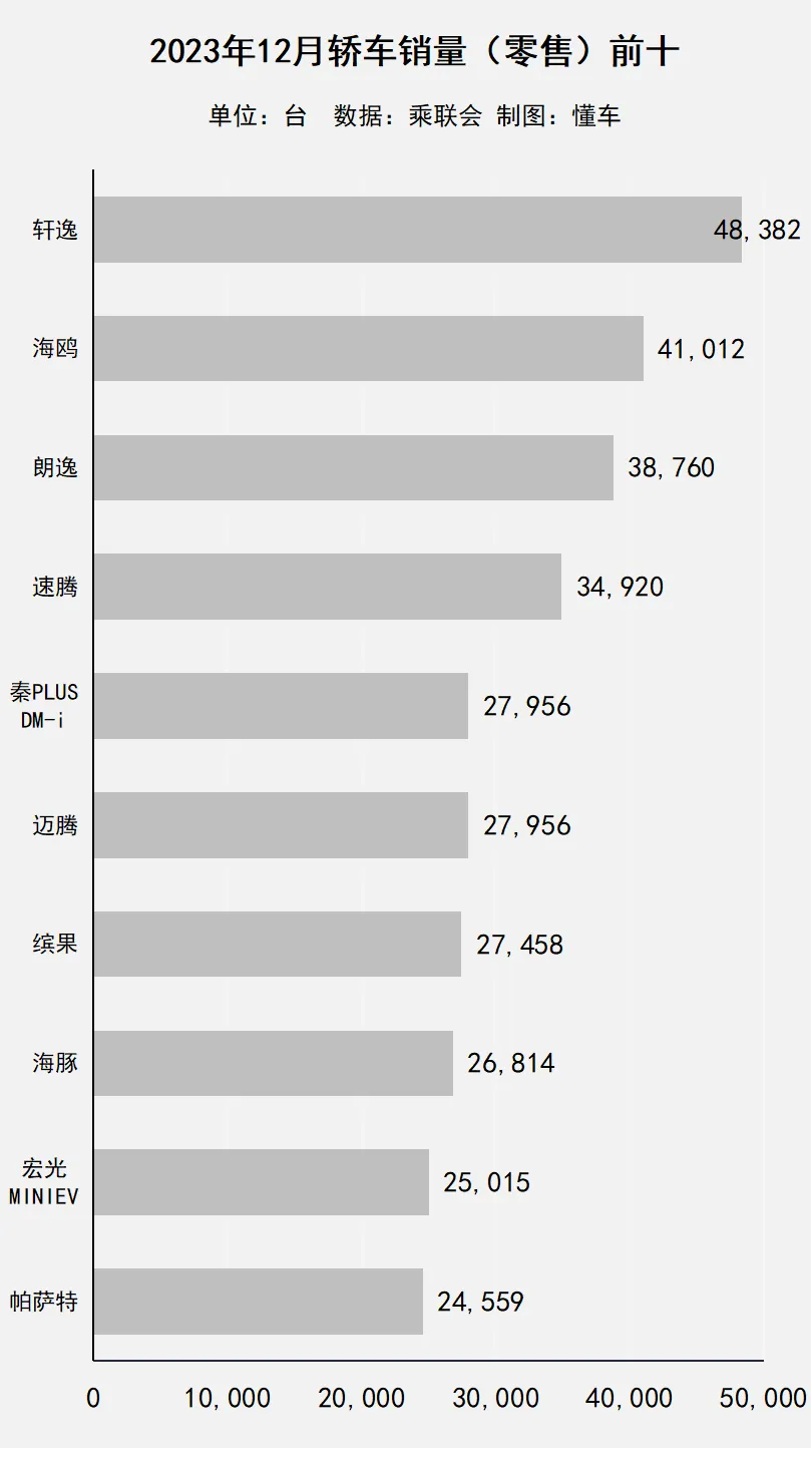 东风日产 轩逸12月销量环比11月增长了近万台(9,280台),达到了4.83万台,在2023年的最后一个月,重回了轿车销量第一。从全年销量看,轩逸达到了37.61万台,同样也是轿车销量第一。不过这并不代表是燃油车复苏,只是因为年底购车的消费者,更偏向燃油车。如果看年销量,2022年轩逸年销量超过45万台,2021年更是超过50万台。轩逸的年销第一,不过是瘦死的骆驼罢了。另外,2023年全年销量前十的轿车中,丰田 凯美瑞、AION S未进12月销量前十,12月销量分别为2.26万台、1.52万台,全年销量分别为22.55万台、22.09万台。以下是完整的“12月轿车销量前十排行榜”“2023年轿车销量前十排行榜”:十万买百万气场!20万买红旗轿跑,11万入国产帕梅,轴距2.9m,保安不敢拦你?
