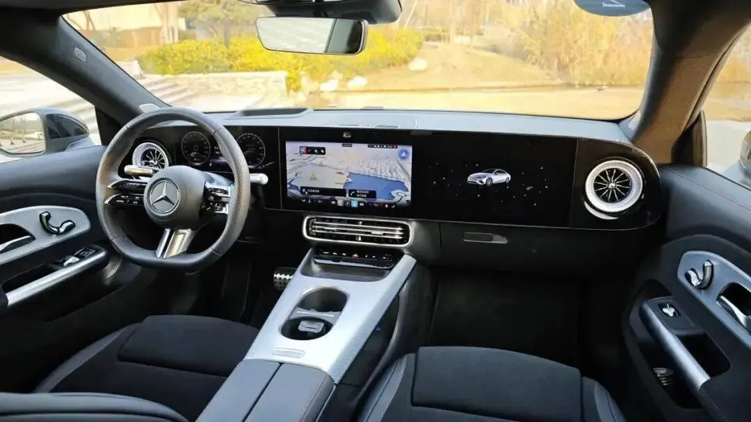 内饰部分延续奔驰一贯风格:双联屏、64 色氛围灯、Burmester 音响,该装的全有。中控台材质摸着顺手,虽然用料不算厚道,但至少看着高级。