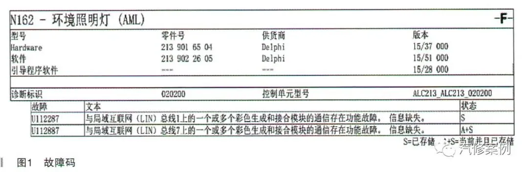 接车后,验证故障现象,果不其然,仪表台左边的氛围灯不亮,仪表台其余的氛围灯正常,变色也正常。连接诊断仪,对电控系统进行快速测试,有相关故障码如图1所示。