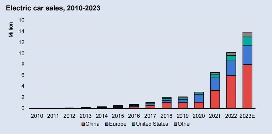 根据国际能源署发布的《全球电动汽车展望2023》显示,日本 2022 年国内纯电乘用车新车销量约 77000 台,渗透率仅为 2.1% ,且有一半以上是五菱宏光MINI EV 尺寸的微型电动汽车。而中国占了全球电动汽车销量 60% 以上的份额,并且据国际能源署预测,今年中国新能源车的渗透率,将接近35%。
