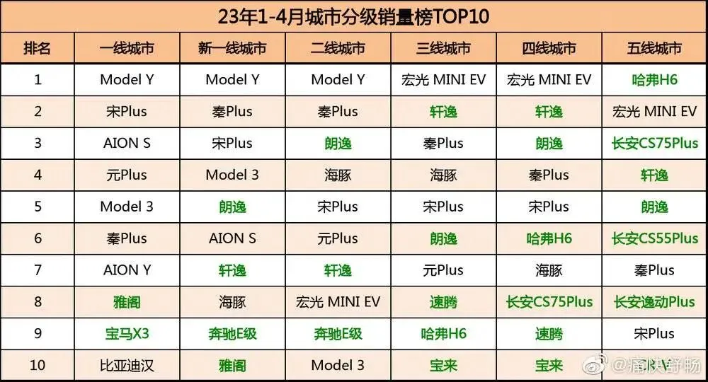 没有一台能打的新能源车,让丰田消失在了各类中国新车销量排行榜中。比如在这张今年前四个月中国一线到五线城市新车销量中,丰田没有一台进入前十。
