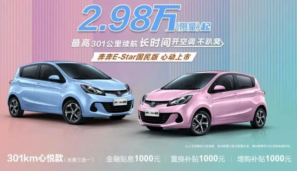 两者虽然外观并无差别,但作为今年1月15日上市的车型,长安奔奔E-Star国民版的价格被拉低到了2.98万元起,比老款奔奔EV最低配版本4.98万元的起售价,还要低了2万元。