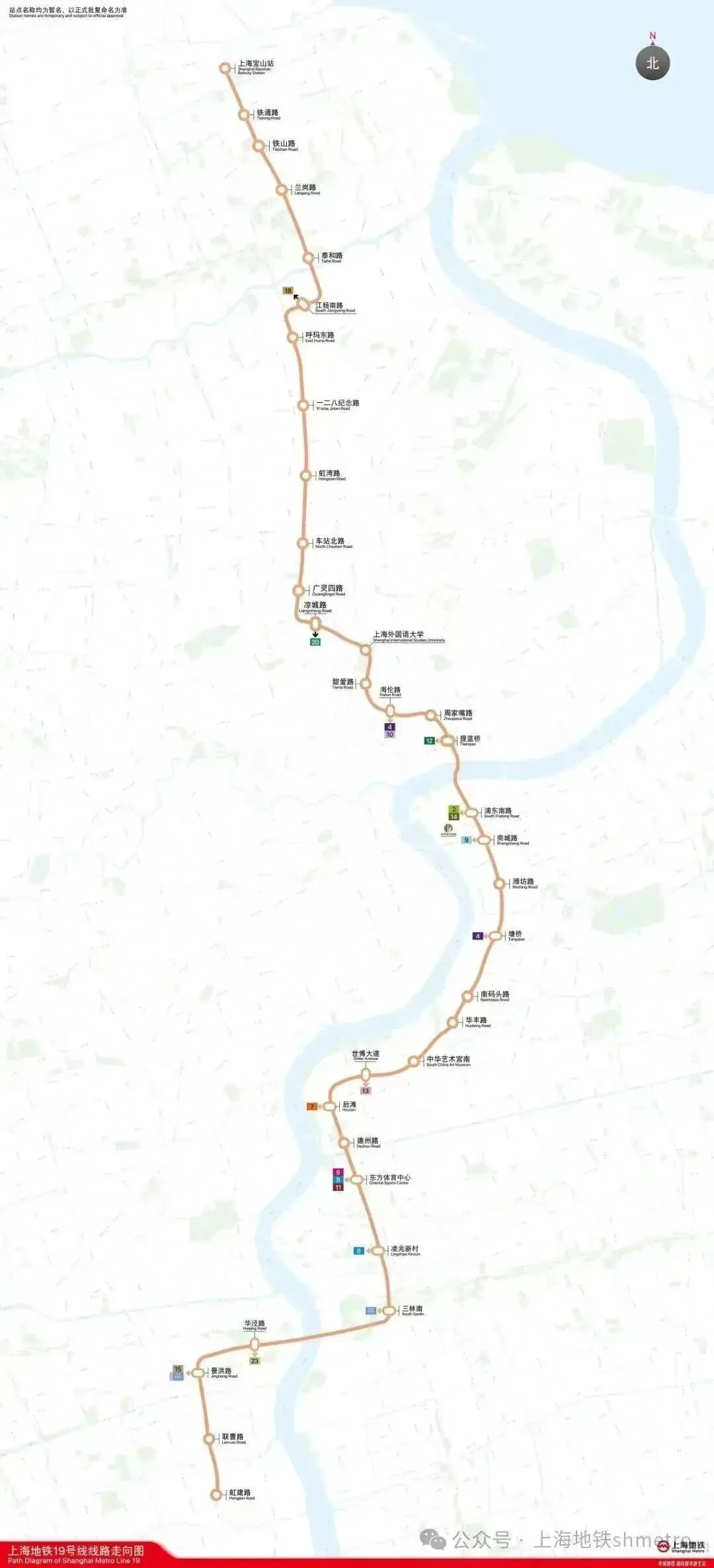 本工程南起虹建路站,北至宝山站站,途径闵行区、徐汇区、浦东新区、虹口区、宝山区共5个行政区。全长约46.168公里全部为地下线,设车站34座,设澄江路车辆基地(与23号线共址)、铁山路停车场共2处车辆基地和江杨南路主变电站(18号线共享)、上海外国语大学主变电站、凌兆新村主变电站共3处主变电站。