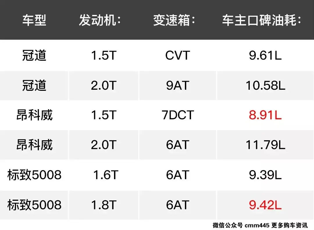 总结:昂科威的1.5T车型采用了7DCT变速箱,在传动效率上有优势,所以在它的油耗比较低。冠道的1.5T车型动力十分充沛,而且后排空间几乎是同级最大的。标致5008的油耗表现出色,动力也比较充沛。这三款车型的竞争力都比较良好,值得推荐!