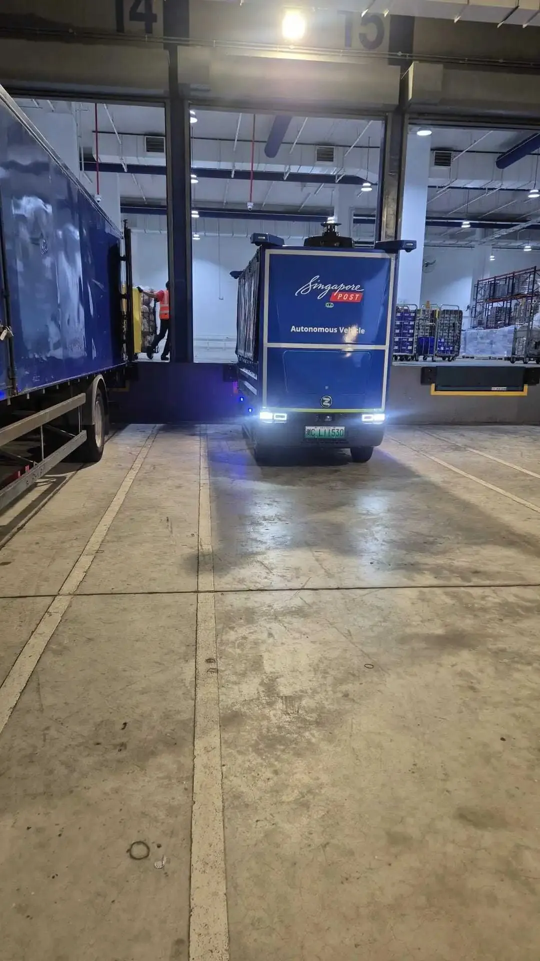 在新加坡邮政的区域电子商务物流中心内,九识无人车将替代传统卡车,承担不同处理阶段及楼层之间的邮件和包裹转运任务。