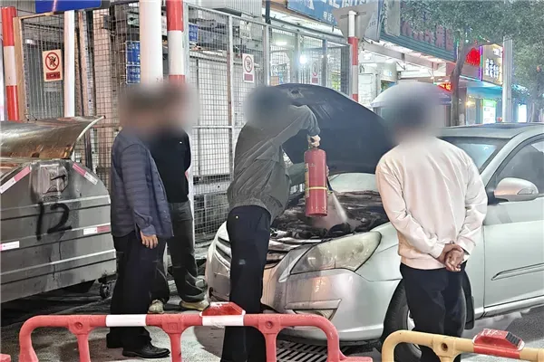见此情形,政工室民警立即挺身而出、紧急处置。一边疏散围观群众、引导车辆有序绕行,维护现场交通秩序防止二次事故发生;一边果断联合县公安局门卫取出灭火器,精准扑救自燃车辆火源根部。