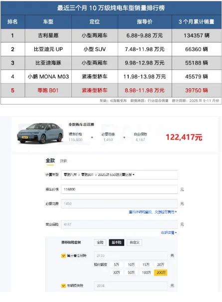 在紧凑型车的销量榜单上,我们经常看到的依然是比亚迪秦PLUS、吉利帝豪、两逸等老牌车型,而零跑B01作为新晋选手,能在这些“老将”中杀出一条血路,其成功秘诀主要有三点:价格亲民、续航亮眼、智能化配置领先。B01顶配车型的续航高达650公里,搭载激光雷达和高通芯片,顶配裸车价仅11.68万元,加上保险和上牌费用,落地价约12.24万元,这在10万级电动车里可以说非常惊艳。