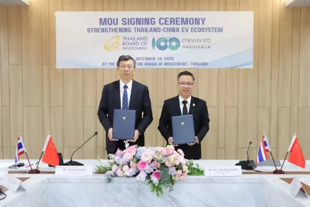本报讯(小朱编译)泰国投资促进委员会(BOI)秘书长、国家电动汽车政策委员会(EV Board)委员兼秘书纳叻标题,2025年12月19日,BOI与中国电动汽车百人会(China EV100)副会长兼秘书长张永伟共同签署了谅解备忘录(MOU)。中国电动汽车百人会是中国政府电动汽车产业发展政策制定方面的重要智库和具有影响力的机构,此次是其在东盟国家签署的首份MOU。八大关键合作伙伴机构——消费税务厅、工业经济办公室、能源政策与规划办公室、泰国汽车研究所、泰国工业联合会、泰国电动汽车协会(EVAT)、泰国汽车工业协会和泰国承包生产促进协会——共同见证了此次签约仪式,并与中国电动汽车百人会探讨了合作事宜。BOI与中国电动汽车百人会签署MOU旨在建立战略合作,共同发展泰国电动汽车产业生态,同时提升泰国企业的能力并将其融入全球电动汽车供应链。合作内容包括交流促进电动汽车产业可持续发展的政策知识与方法;营造公平的竞争环境;培养人才以及发展生产、废旧电池管理、充电系统和电池交换系统在内的整个生态系统。通过与中国企业的技术转让合作提升泰国企业水平;建立中泰联合投资支持机制;在中国和泰国举办合作活动与论坛,例如每年5月在SUBCON Thailand展会期间举办的泰国-中国电动汽车论坛,以及每年3月在中国举办的中国电动汽车百人会论坛。纳叻表示:“此次泰国合作伙伴与中国电动汽车百人会的合作,将使泰国能够深入了解中国电动汽车产业的政策和发展方法,并将成为连接两国企业、促进相互学习交流的桥梁,同时也是反映业界意见的渠道,从而确保制定的各项电动汽车相关政策和措施高效有力,推动泰国汽车产业的可持续发展。”中国电动汽车百人会副会长兼秘书长张永伟表示,此次合作对中泰两国的电动汽车产业具有重要意义。中国电动汽车百人会支持泰国成为东盟电动汽车中心的愿景,并乐意促进中国企业增加在泰国的零部件采购,同时向泰国企业转让技术。当前技术更新迅速,且中国持续重视研发,因此并不像其他行业那样担心技术被模仿。此外,在泰国进行技术转让和生产,有助于降低企业独自出海投资的风险,还能加快产品上市速度,因此双方企业深化合作的机会很大。此外,未来汽车产业的发展将更加注重汽车智能化系统的开发,这也将为泰国电子和软件开发商企业提供参与该领域技术研发的机会。截至2025年10月的数据,BOI已批准的电动汽车及相关产业投资促进申请总额达1400亿泰铢,涵盖:BEV汽车生产项目21个,总投资额404.49亿泰铢;电池生产项目54个,总投资额794.73亿泰铢;其他关键部件(如牵引电机、BMS DCU、逆变器、车载充电器)生产项目45个,总投资额100.02亿泰铢;充电站和电池交换站项目32个,总投资额60.66亿泰铢。风雨兼程七十载 ● 不忘初心渡百年