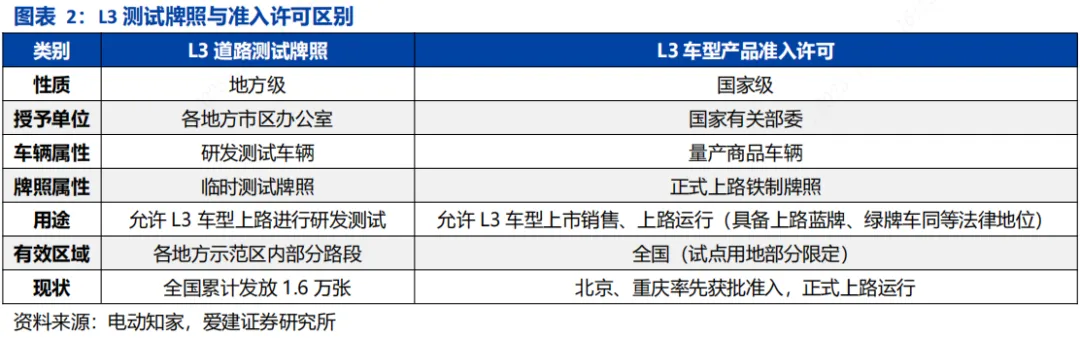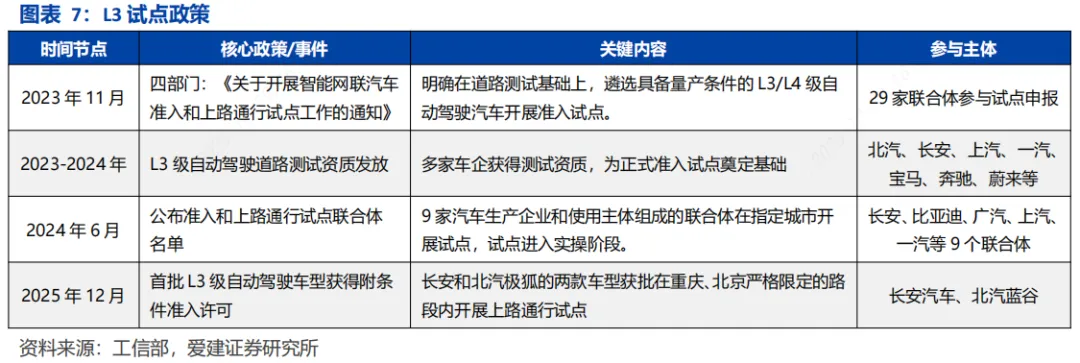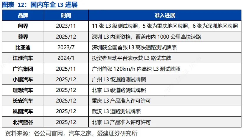 ■L3准入破冰,自动驾驶从测试迈向有条件运营。我国首次对量产乘用车开放L3级自动驾驶许可,严格限定区域、速度及使用主体,L3系统激活后责任主体为车企或系统供应商。该车型暂限试点使用单位运营,不向个人销售。获批车型1)长安深蓝SL03:重庆指定高速及城市快速路实现最高50km/h的单车道自动驾驶,适用路段包括内环快速路、新内环快速路及渝都大道等。2)极狐阿尔法S5:北京部分高速路段实现最高80km/h的单车道自动驾驶,适用路段包括京台高速、机场北线高速及大兴机场高速等。