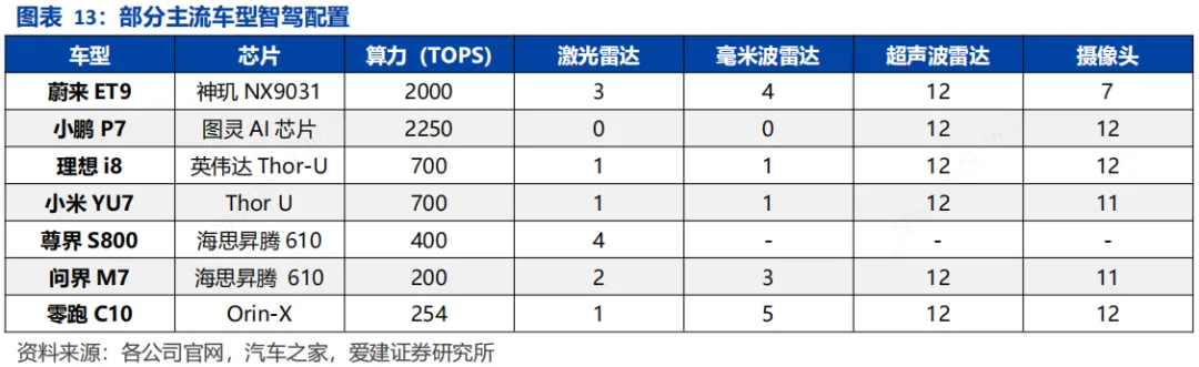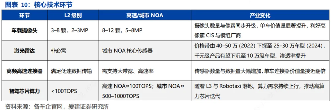 ■L3为高阶智驾规模化关键,产业链价值量上移。在限定ODD(运行设计域)与速度边界下,L3有望率先在高速、封闭或半封闭场景实现复制推广,为城市NOA与更高阶自动驾驶积累法规、数据与运营经验。感知、算力与系统集成要求显著提升,推动摄像头、激光雷达、高速连接器与高算力智驾芯片等环节单车价值量持续上行。