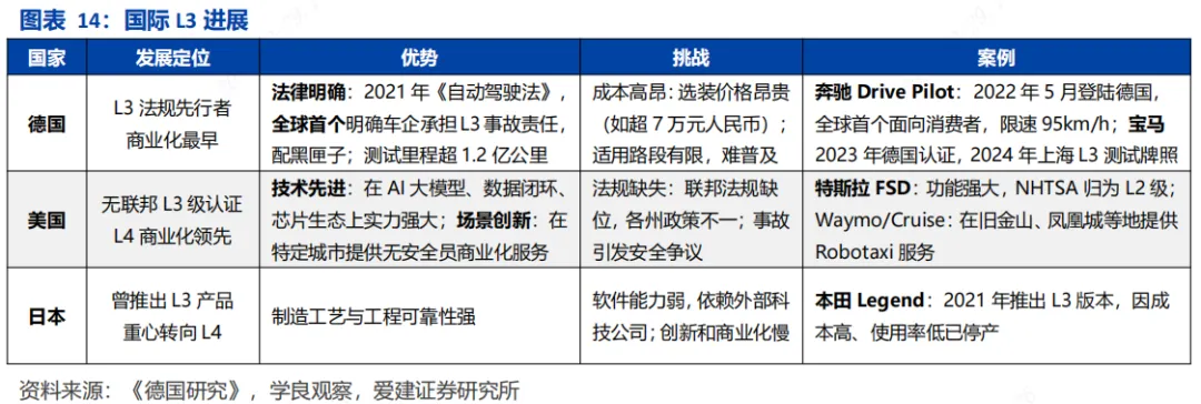 ■ 国际L3发展分化,德国立法明确,美国直指L4,日本商业化保守。德国2021年《自动驾驶法》明确L3系统激活期间,事故责任由车企承担,并要求配备数据记录装置。奔驰 DRIVE PILOT功能适用速度由60km/h提升至95km/h。美国政策与资本资源向L4级Robotaxi倾斜,L3未成为主流过渡方案。日本本田曾推出L3车型Legend,但受限于高成本、使用场景受限及用户使用率偏低等因素已停产。