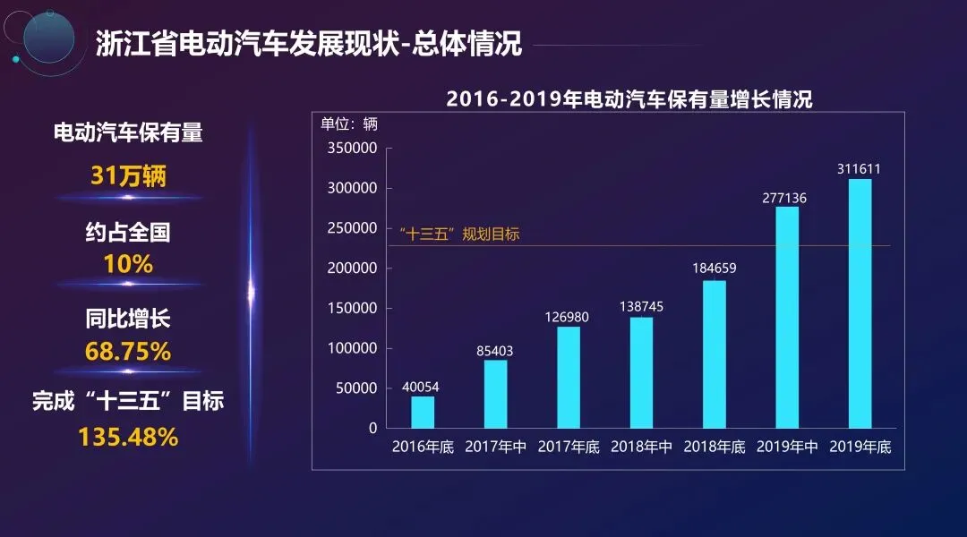 “十三五”规划目标是到2020年推广应用电动汽车23万辆以上,浙江2019年已完成“十三五”规划目标的135%,超过目标值8万辆,提前并超额完成规划目标。
