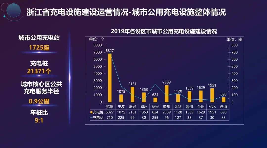 《浙江省电动汽车充电基础设施“十三五”发展规划》明确要求,到2020年,城市核心区公共充电服务半径小于0.9公里,公用充电桩与电动汽车比例不低于1:12,2019年浙江省城市核心区公共平均充电服务半径为0.9公里,平均车桩比为9:1,提前完成“十三五”规划目标。