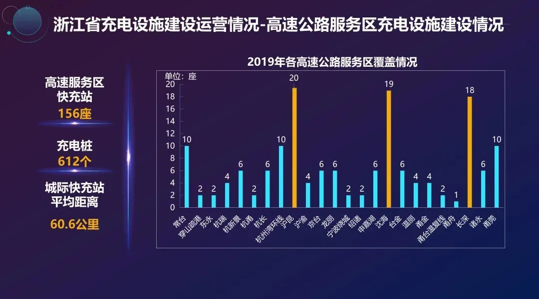 高速公路服务区充电设施整体布局方面,为满足电动汽车长远距离城际出行需要,浙江进一步完善全省高速服务区充电设施布局,截至2019年底,全省境内28条高速公路的24条中已经建设了充电站,建成高速服务区快充站156座,充电桩612个,形成浙江“9纵5横1环”高速城际快充网络。