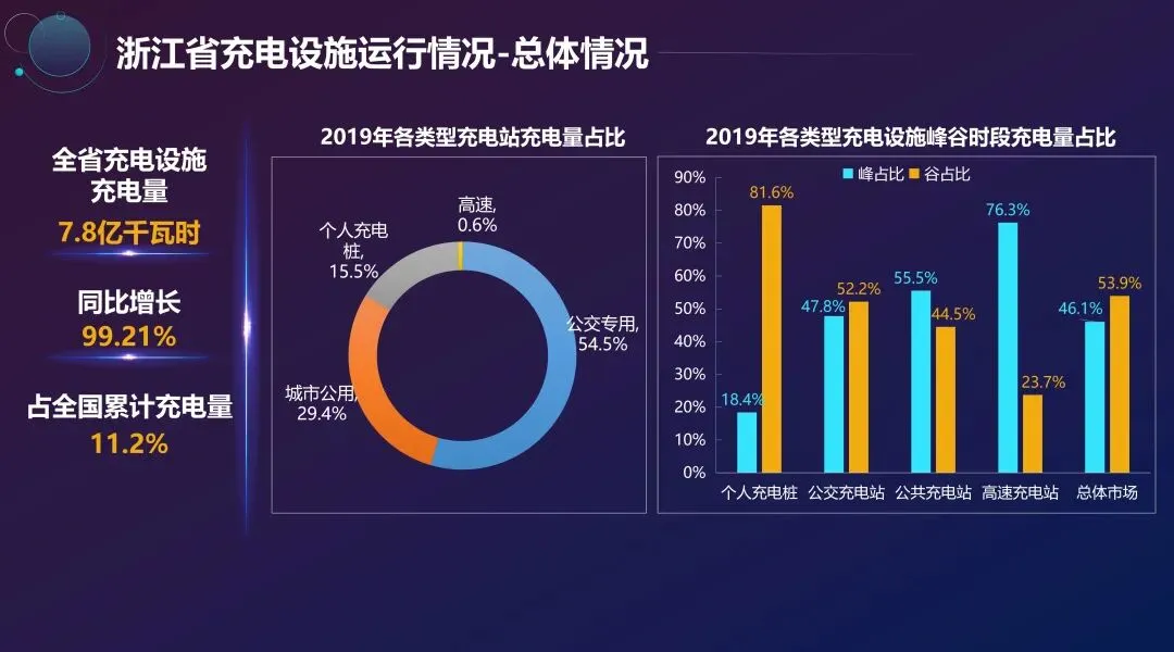 《白皮书》显示,浙江省电动汽车发展水平呈现总体快速上升趋势,且电动汽车对浙江省电力负荷平衡起到积极的正面作用。2019年,浙江全社会充电量的峰谷比为0.85,各类型的充电量峰谷比分别为:公交专用0.92、城市公用1.25、高速3.21、个人充电桩0.23,个人自用充电明显避开高峰时段,对削峰填谷有较明显的促进作用。