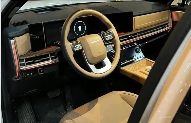 打开胜达车门,第一眼的高档感是实打实的。真皮包裹的方向盘和座椅、贯穿式大联屏、全系L2级辅助驾驶、双层隔音玻璃、前后排座椅加热和通风,这些配置在汉兰达上要么要选装、要么要到顶配才有。我们在静态体验时甚至发现,胜达的中控台软质包覆面积、皮革触感、金属饰条工艺都比汉兰达同价位车型更细致。这种内饰档次感的直观差异,正是新能源车带动行业内卷后的“新合资标准”。