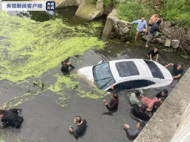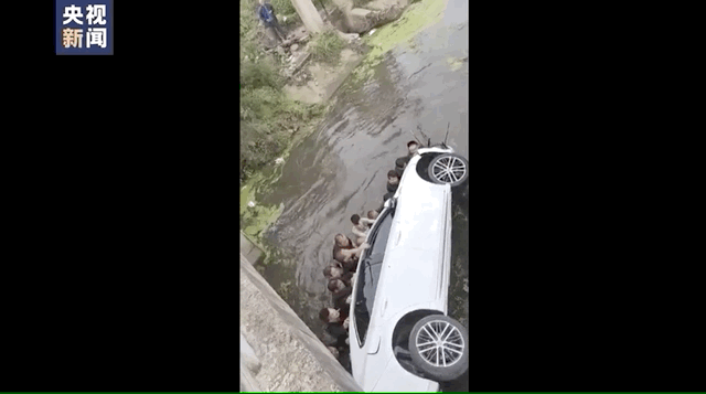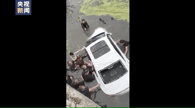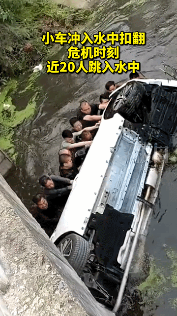 终于合力将落水车辆翻正