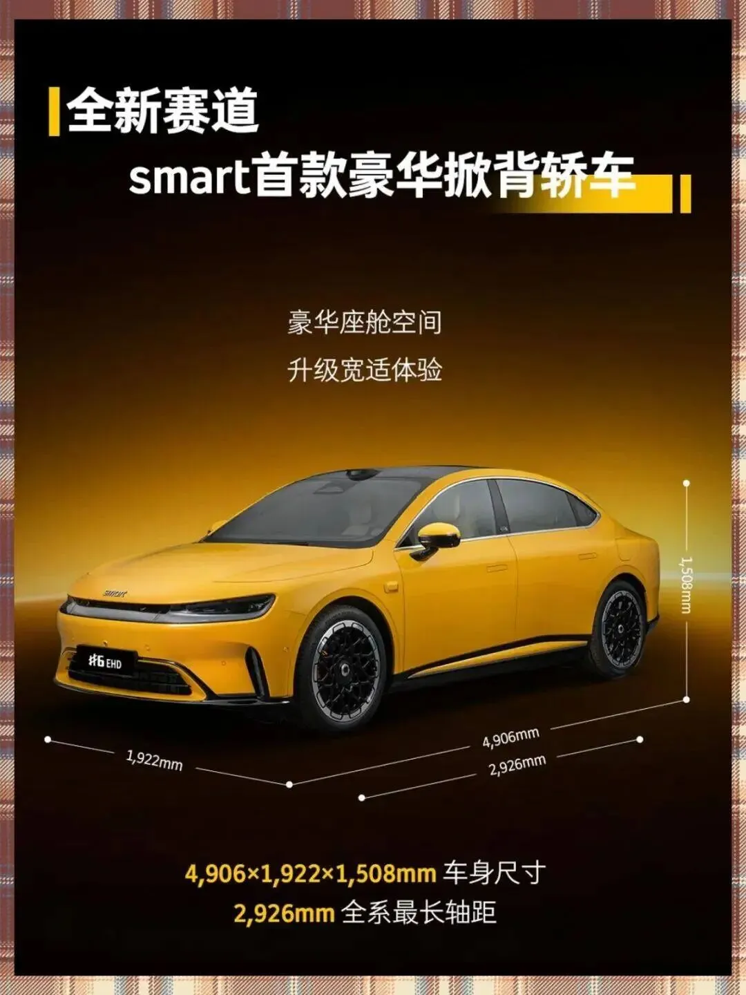smart精灵 #6 EHD 的体型已经不“小巧”了:长宽高4906×1922×1508mm,轴距2926mm,这个体量已经和比亚迪汉DM、银河E8是一档。