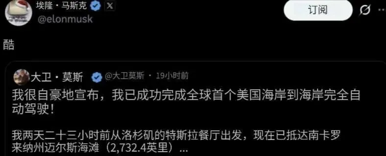 地图显示,车辆从美国西海岸到东海岸,横穿整个美洲大陆,这正是马斯克多年前的预想,Coast to coast,马斯克为之点赞喊“Cool”。