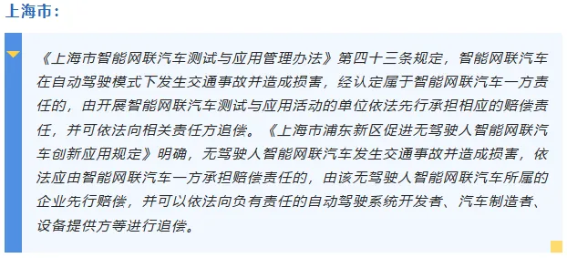 目前从上海、深圳、武汉的做法来看,如果是辅助驾驶场景下发生事故,车辆驾驶人应承担责任,如果是完全自动、无人驾驶的智能网联场景下发生事故,由车辆所有人或者管理人承担赔偿责任。