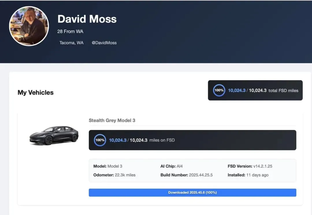 根据 David Moss 本人在 X 上发布的信息,这次行程覆盖高速公路、城市道路、施工路段,以及所有 Supercharger 充电站的自动泊车与驶离,全程未发生任何一次人为接管或系统退出,包括停车与充电过程。