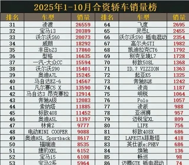 像卡罗拉,以前动不动月销三四万台,现在一个月只卖6千多。思域更惨,4千多台,差点连前三十都进不去。伊兰特、君威这些车,三四千台的销量,跟当年的辉煌比起来,简直是天上地下。