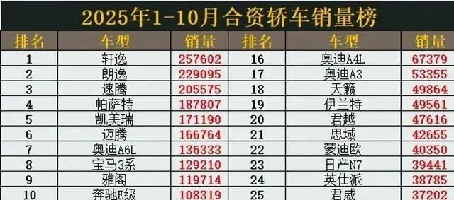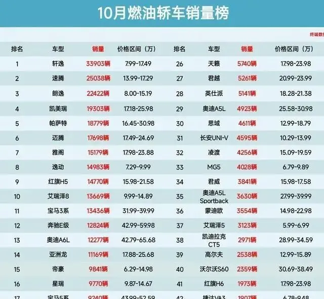 但你要说燃油车就不行了?那也不对。榜单前十五名里,还有十一个位置是燃油车占着的。速腾卖了2万5,朗逸也有2万2,凯美瑞、帕萨特这些老将,一个月都能卖出去一万七八。
