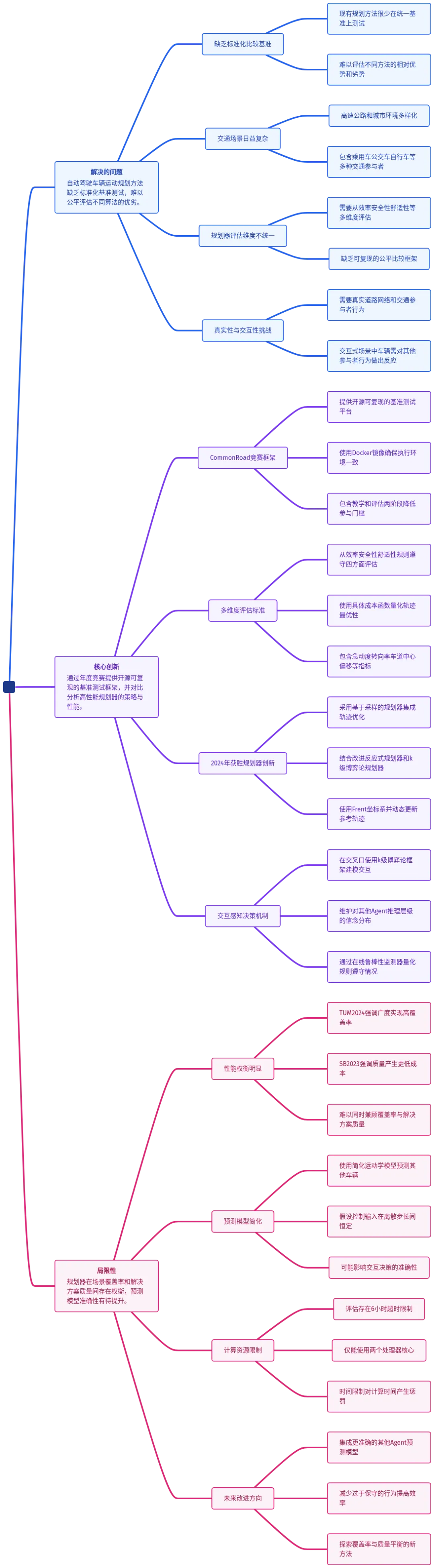 这就是当前自动驾驶运动规划的核心困境:单一策略的规划器,难以在“覆盖率”(能解决多少场景)和“解决方案质量”(解有多好)之间取得完美平衡。 2024年CommonRoad大赛的结果,将这一矛盾赤裸裸地呈现了出来。