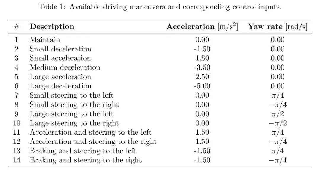 冠军方案为自车定义了如表1所示的离散动作空间,包含跟车、巡航、左转等基本机动。