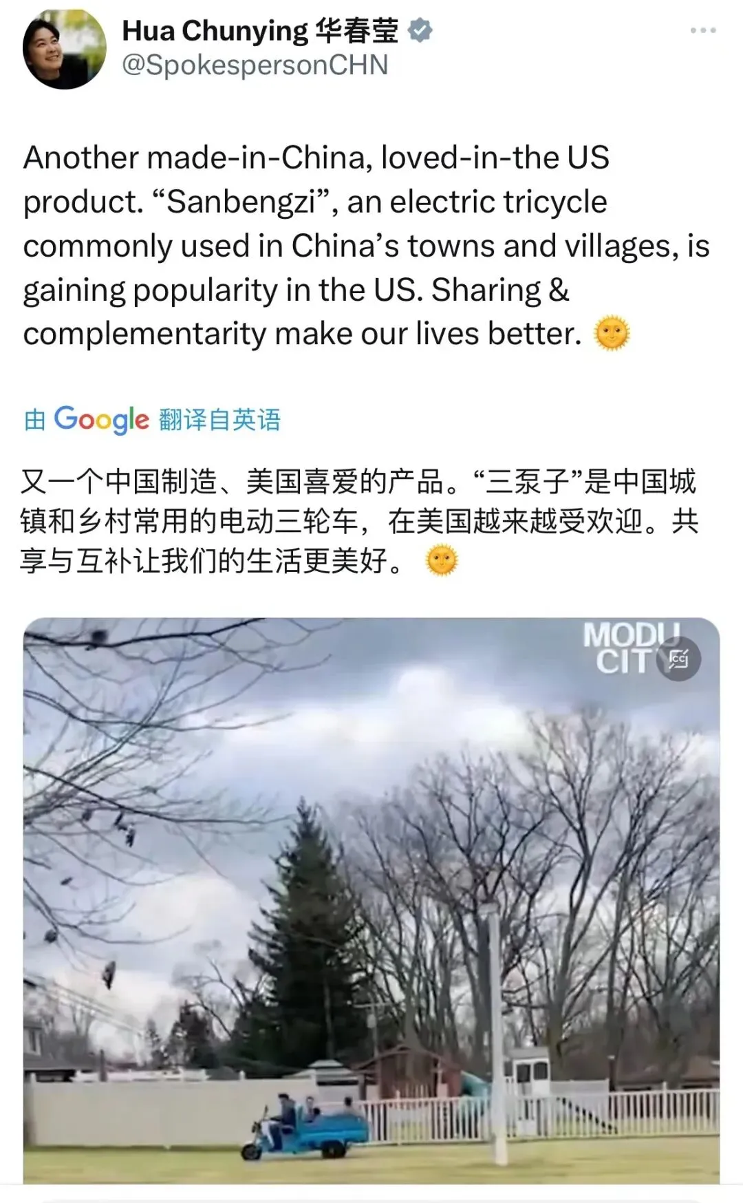 连中国外交部部长助理华春莹,也在社交平台上对三蹦子称赞有加: