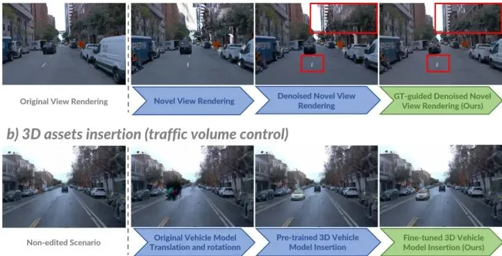 生成了高质量的新视角图像后,SymDrive并没有停手。它把这些“修好”的图当作额外的真值,回头去微调(Fine-tune)最初那个3DGS模型。这样,3DGS模型本身也学到了如何更好地渲染新视角,形成了一个“渲染-修复-优化”的增强闭环。下次再用这个优化后的3DGS模型生成训练数据时,起点质量就更高了。无需训练!车辆插入如何实现光影自然融合?