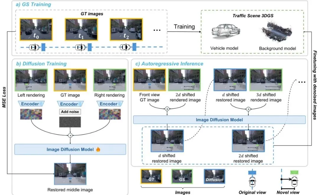 这个名字听起来有点唬人,我们拆开来看:“对称”指的是数据准备方式,“自回归”指的是推理生成策略,“在线修复”指的是它边生成边优化3D模型的能力。图2:新视角修复流程概览。a) 用真实图像分别训练前景车辆和背景场景的3DGS模型。b) 以真实视角为中心,生成对称的GS渲染图作为训练数据。c) 通过自回归迭代过程逐步生成去噪的新视角图像,并用这些图像微调GS模型。要训练一个修图模型,你得先有“模糊原图”和“清晰目标图”的配对数据。以前的方法要么用随机掩码,要么加人工扰动来制造模糊图,但这和真实新视角的模糊模式不太一样。SymDrive想了个聪明办法:它先有一个用真实视角照片训练好的3DGS模型(这个模型渲染新视角会模糊)。然后,对于一张真实(Ground Truth, GT)照片I₀,把摄像头向左移d米渲染一张图I₋d,再向右移d米渲染一张图Id。这两张模糊的渲染图,加上中间那张清晰的GT图I₀,就构成了一组完美的训练数据对。
