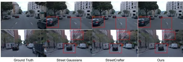视觉对比更是碾压。从下面两图可以看出,SymDrive生成的画面细节最丰富,车道线、路面纹理、交通灯、周边车辆都更清晰、更准确,远超其他方法。图3:与ReconDreamer [12]和ReconDreamer++ [27]的定性对比。图4:与Street Gaussians [5]和StreetCrafter [11]的定性对比。RQ2:SymDrive在车辆插入任务上也是SOTA吗?是的,大幅领先。下表展示了插入车辆并进行和谐化处理后的FID分数(越低越好)。SymDrive以显著优势排名第一。值得注意的是,专门用于新视角修复的Difix3D+在这个任务上反而使FID变差了,因为它会不加区分地修改整个图像。而SymDrive的针对性修复策略优势尽显。| Method | ModelCapability | FID√ |