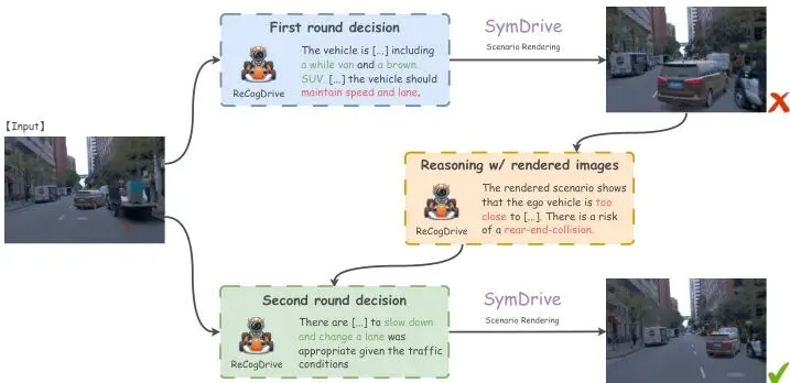 视觉上,插入的车辆光影自然,与背景完美融合,纹理细节也更逼真。初步验证显示潜力巨大。SymDrive可以生成高保真的闭环仿真序列。如图6所示,它可以模拟正常车流,也可以生成激进变道、超车等高危场景。更重要的是,论文尝试将生成的仿真场景输入给一个端到端的视觉语言驾驶模型进行测试,模型能够基于仿真的危险场景调整其初始决策,这证明了SymDrive生成的数据对于评估和提升自动驾驶系统具有实用价值。图7:在我们的仿真环境中进行VLM规划与推理的示例。局限与展望:远距离物体与物理约束仍是挑战