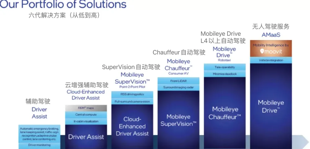 Mobileye自动驾驶六代解决方案,从左到右能力逐渐递增。图片来自招股书