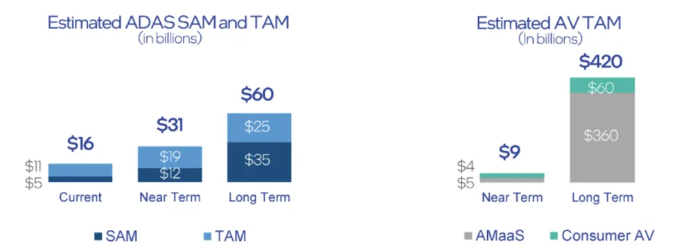 Mobileye设定的短期潜在市场(TAM)为400亿美元,可获得市场(SAM)为210亿美元;长期来看,潜在市场为4800亿美元,可获得市场为4550亿美元。图片来自招股书。