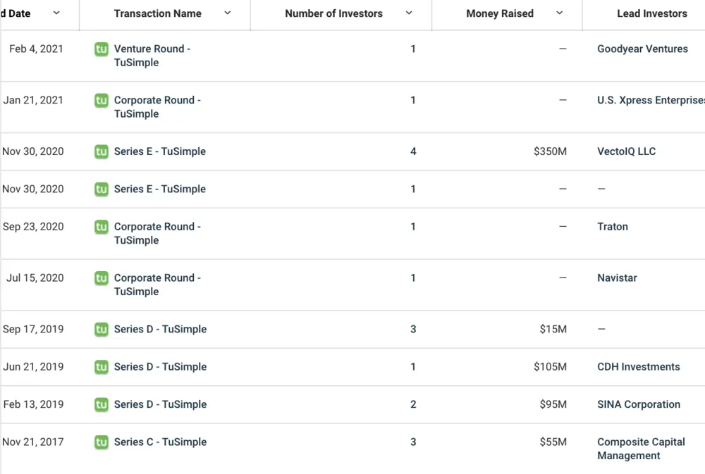 图森成立以来的融资情况,图片来自Crunchbase