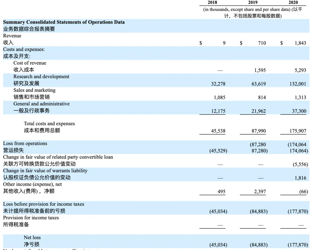 在招股书里,图森仅公开了2018年、2019年以及2020年三年的营收情况。很显然,即便是2020年收入达到了百万美元级别,但这三年收入的总和也不过是总成本的零头。