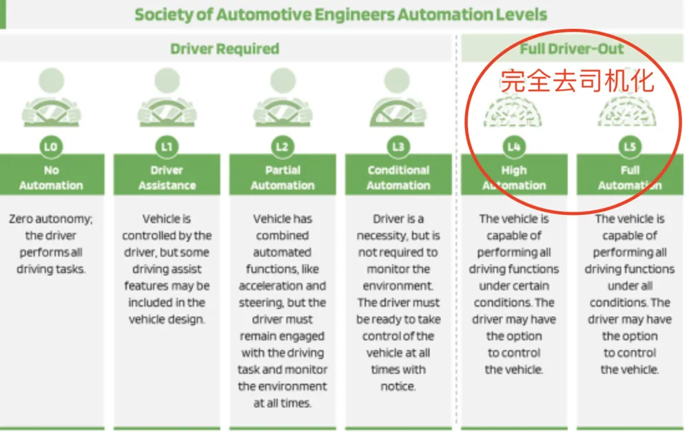 按照由美国汽车工程师协会(SAE)的粗略定义,L4指的是“高度自动化”等级,车辆可以实现全程不需要驾驶员,但会有限制条件,譬如限速,且驾驶区域相对固定。
