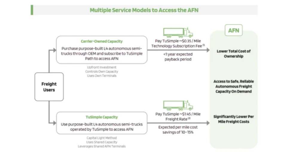 在第二种模式里,与1.7美元/英里的卡车运输市场平均价格相比,图森定的运营价格为1.35美元/英里