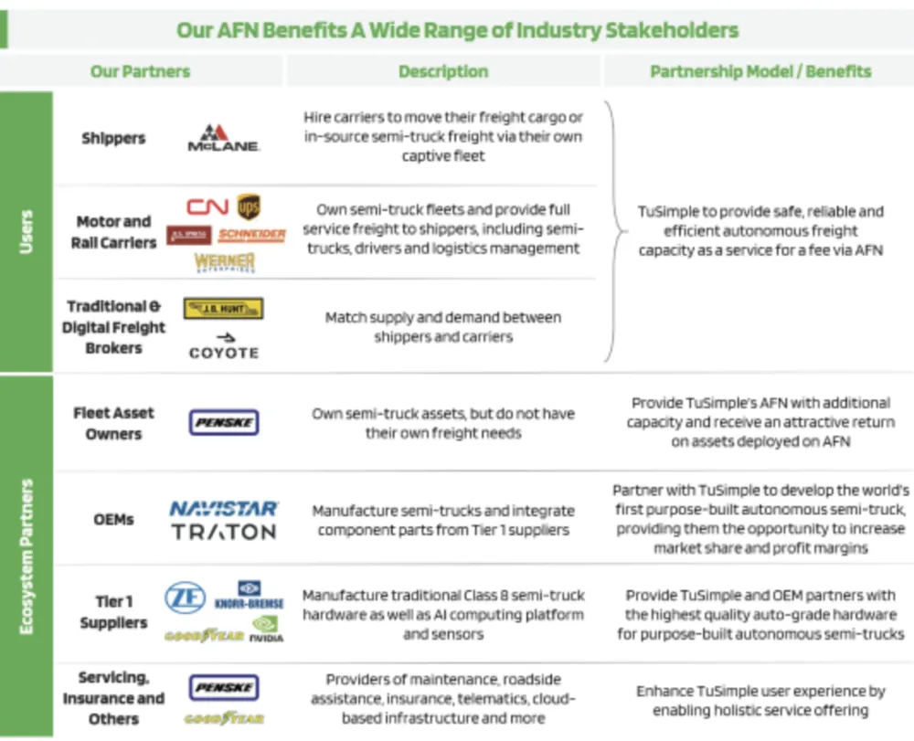 当然,作为一家技术亟需验证的企业,往上连接卡车专业制造商,往下连接物流运输巨头,将托运人(货主)、承运人、运输公司、卡车车企,第三方服务商纳入到自己的生意网中,非常有利于加快商业化步伐。