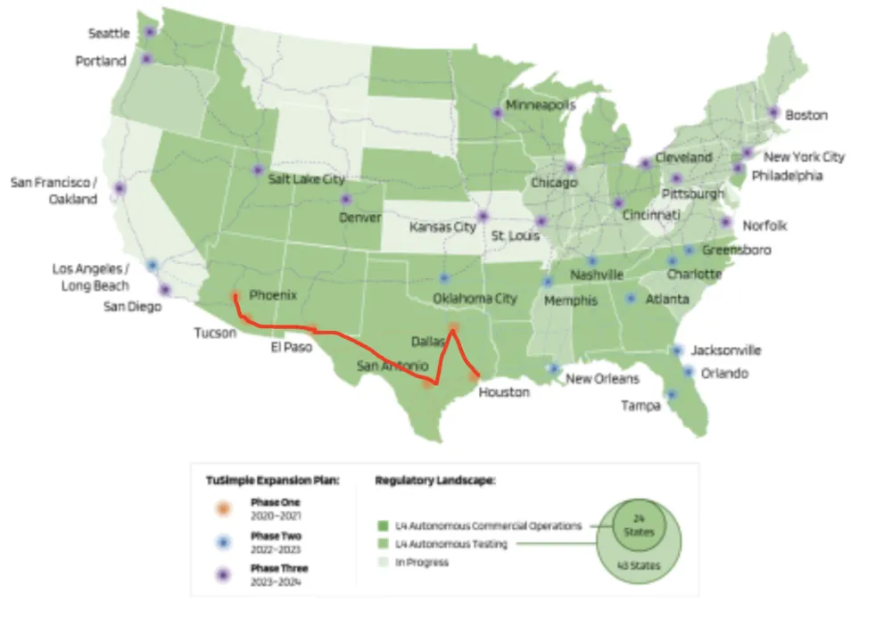 另一种方法就是“把一条专线跑熟”。为了更快上路,自动驾驶公司通常会开辟出一些“相对单一的固定送货专线”。譬如图森在招股书中展示的一条“南部路线”(2020~2021)——