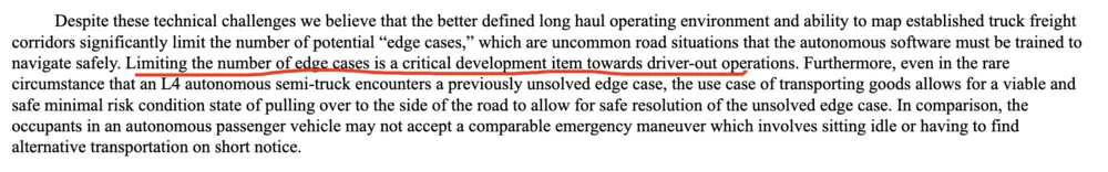 至于开辟适用于自动驾驶卡车的运输专线,当然,一家技术公司完全可以选择一条最适用于自动驾驶卡车运营的路线(法规、道路条件都符合要求),将安全威胁指数降到最低。