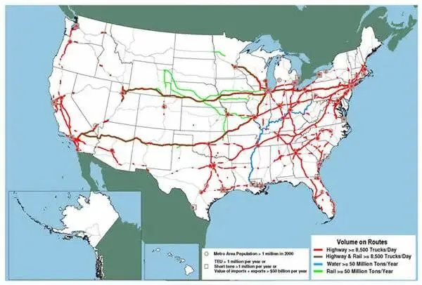 红线指“每天至少运送8500辆卡车的公路段”,每年运送大约5000万吨货物;棕线指“承载8500辆卡车、铁路平板托运以及集装箱托运车的其他高速公路段与平行铁路线,这类货物通常是高价值、时间敏感的货物”