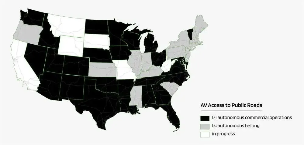 白色为目前还未同意上路的州,灰色为仅允许测试的州,黑色是允许商业化部署的州,