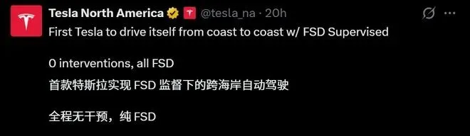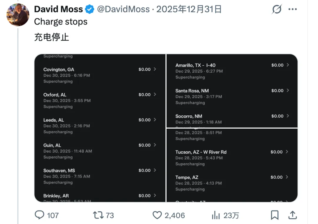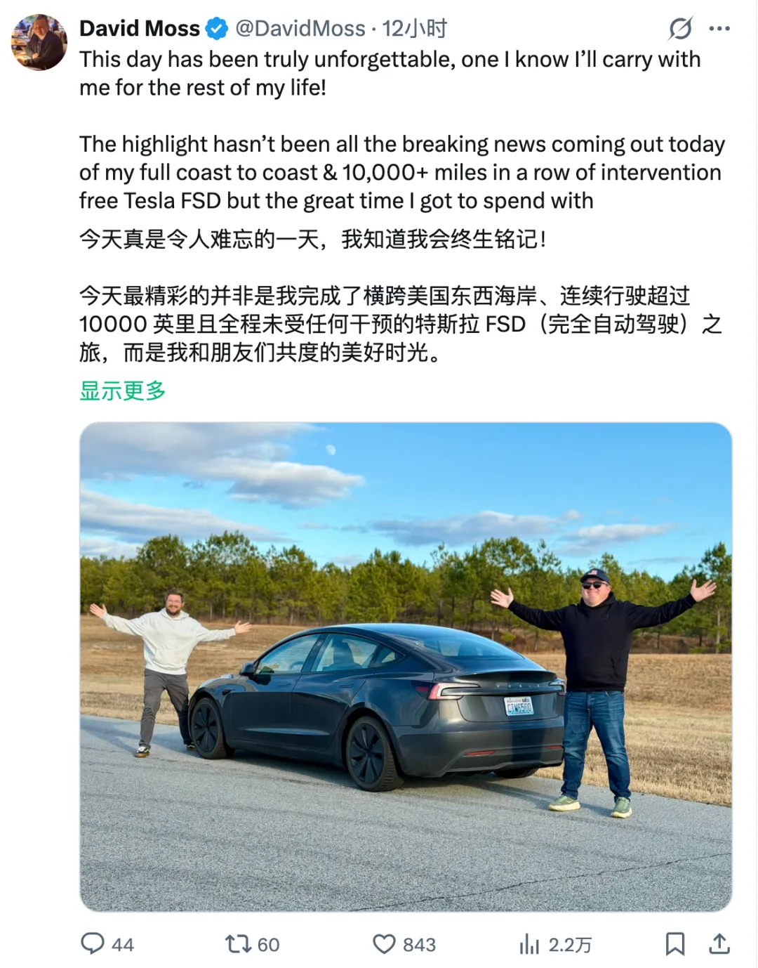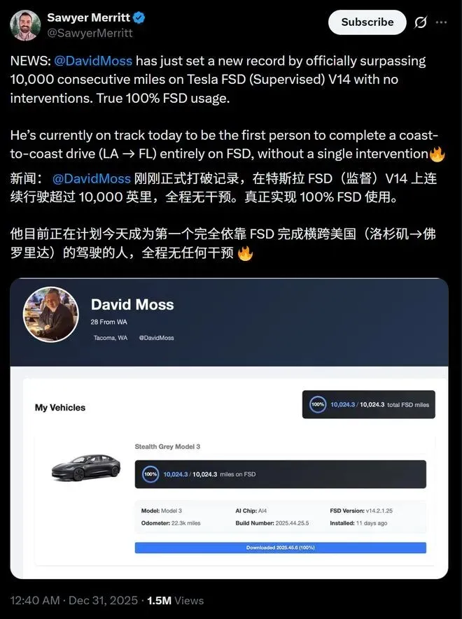 2025年12月30日,一位叫David Moss在X上发推文宣称:自己驾驶着一辆深灰色的特斯拉Model 3,从洛杉矶的特斯拉餐厅出发,跨越24个州,用时2天20小时,行驶2732.4英里,零次人工接管,包括所有停车——抵达南卡罗来纳州默特尔比奇。