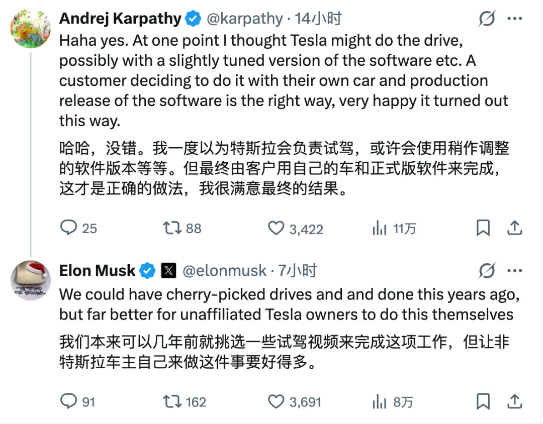 这也是为什么Andrej Karpathy(特斯拉AI负责人)的回应措辞那么精确:"这是特殊的,因为从一开始,东西海岸驾驶就是自动驾驶团队的核心目标。我们投入了无数小时进行'马拉松式的视频片段审查',逐个分类和改进每一次干预,最终实现了零干预。看到系统最终实现这一点,实在太棒了。"