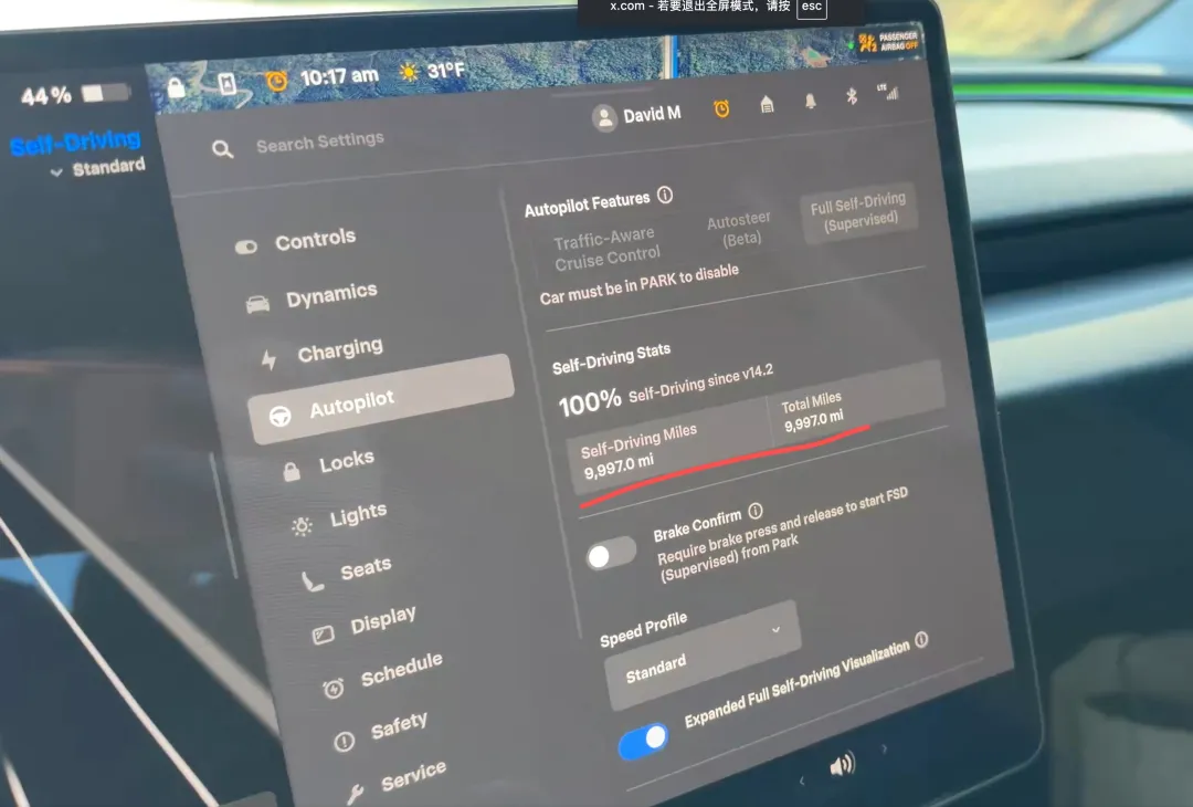 David Moss不是什么特殊人物,他说自己卖激光雷达设备(用于3D建模),"我不是特斯拉员工,没有特殊固件,甚至还拥有零股特斯拉股票"。 他买的Model 3是标配,只不过配备了最新的Hardware 4芯片(AI4)。他之所以驾驶这2732英里,最初的原因很简单——用FSD的统计界面记录数据,看看能坚持多久而不需要人工接管。